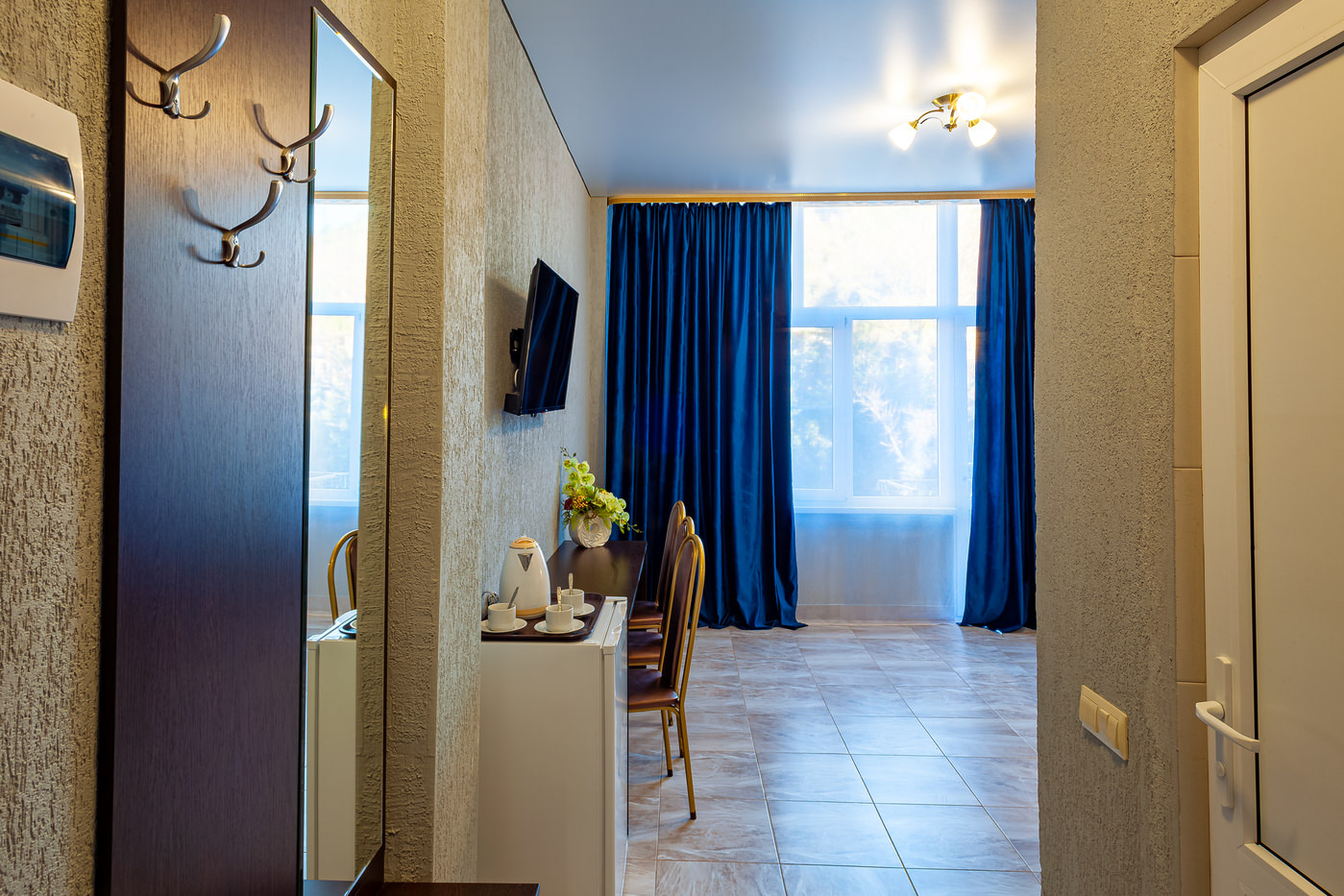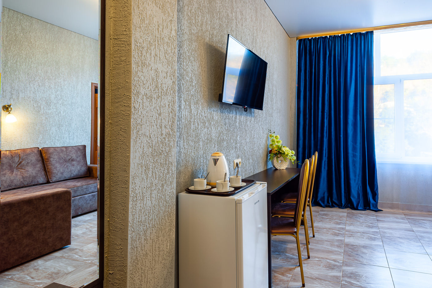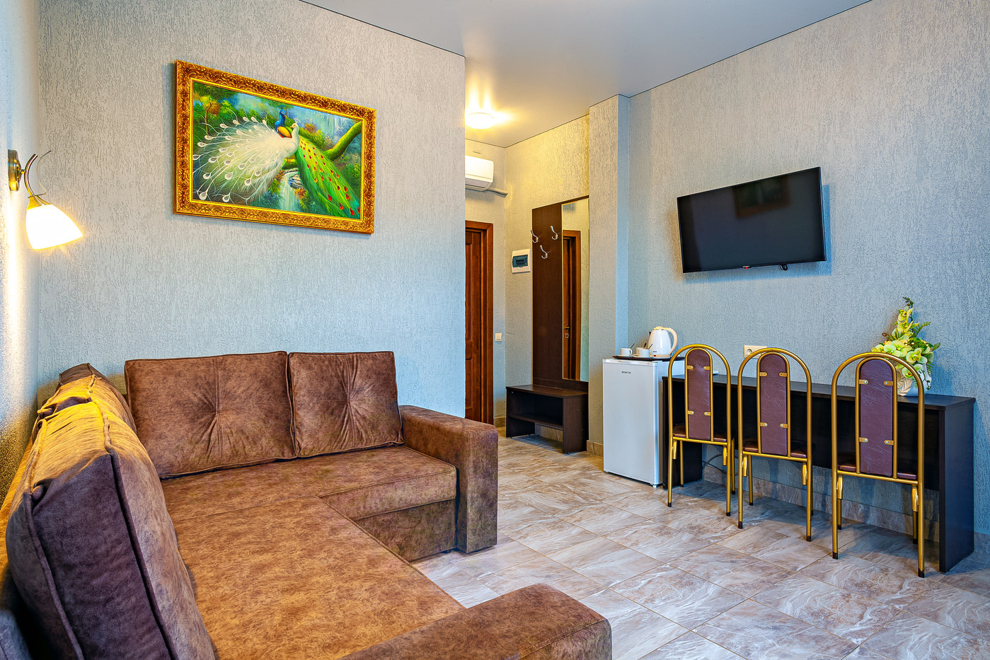 Площадь номера - 45 кв.м. 2 осн. места. 3 доп. места. Мебель: вешалка, диван раскладной, зеркало, кровати односпальные /одна двуспальная кровать, прикроватные тумбочки, стол, стулья, шкаф. Оборудование: мини-холодильник, сплит-система, телевизор, чайный набор посуды, электрочайник. Санузел: с душем, тапочки, туалетные принадлежности, фен. Сервис: Wi-Fi бесплатно, смена полотенец, смена постельного белья, уборка номера.