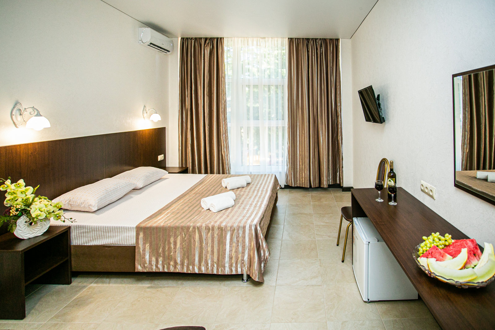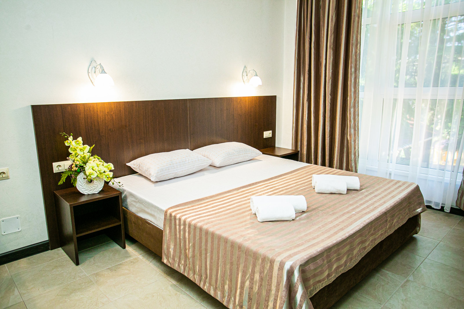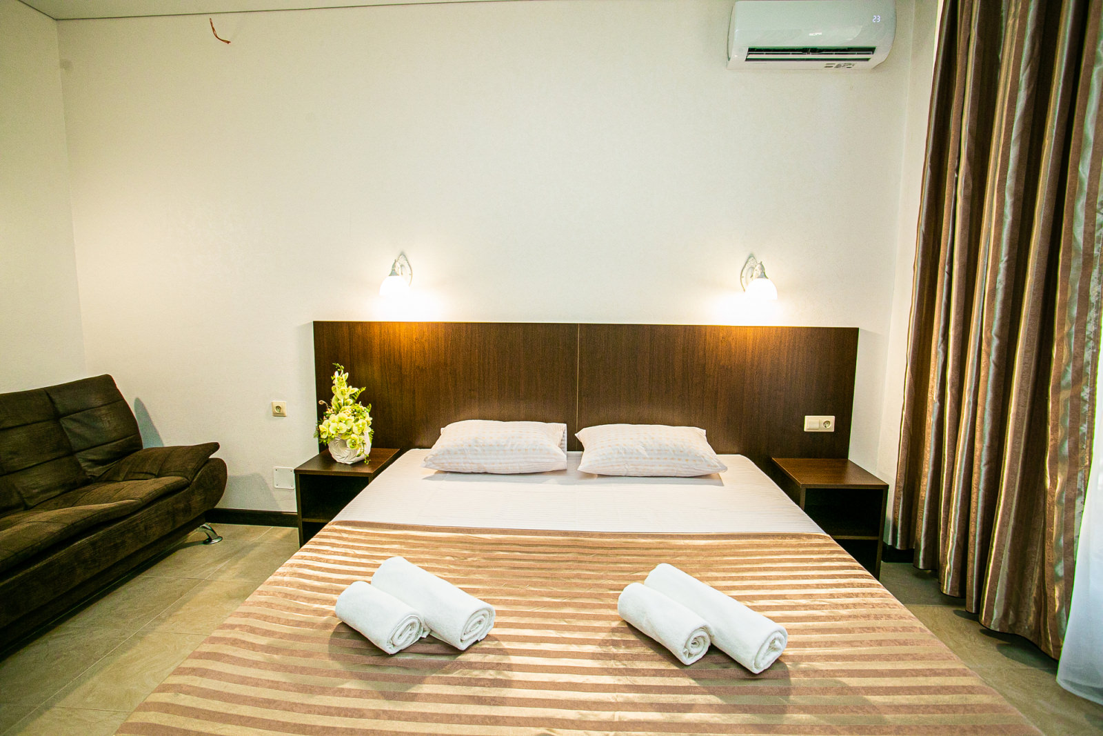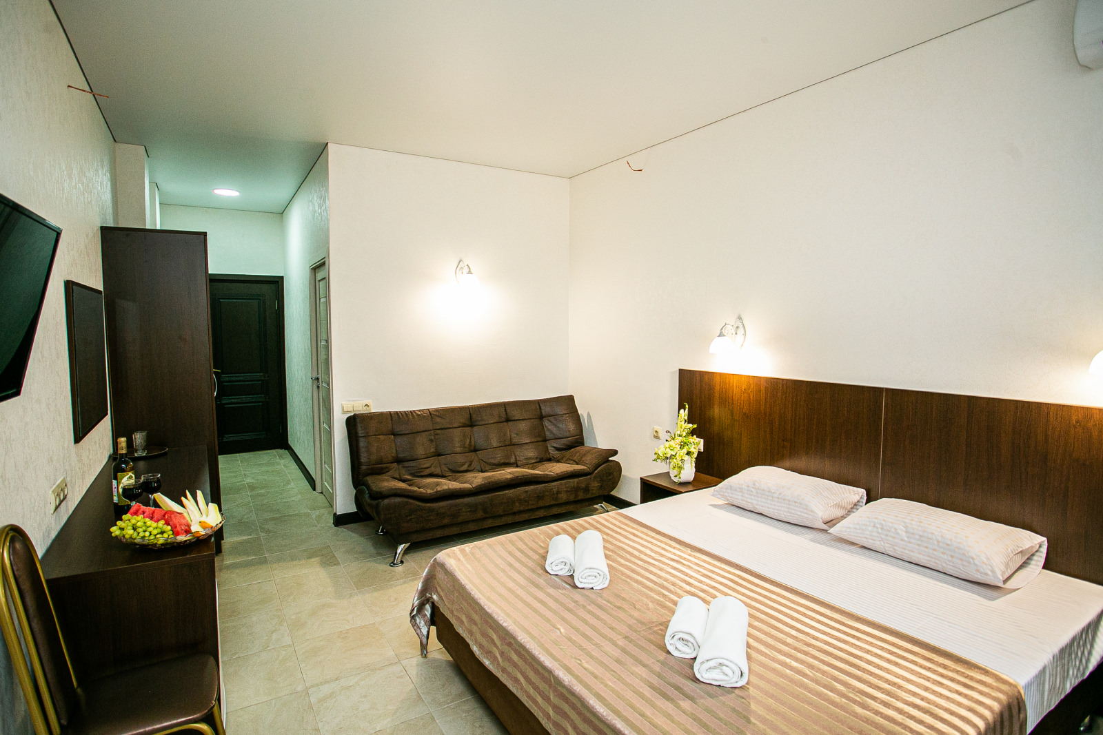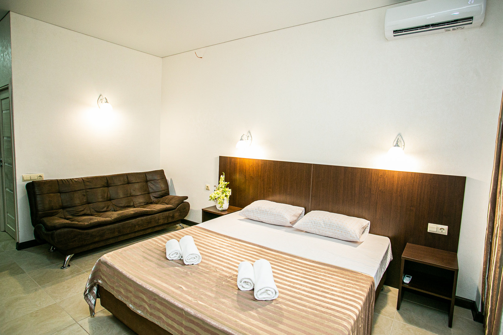 Площадь номера - 25 кв.м. 2 осн. места. 2 доп. места. Мебель: вешалка, диван раскладной, зеркало, кровати односпальные /одна двуспальная кровать, прикроватные тумбочки, стол, стул, шкаф. Оборудование: мини-холодильник, сплит-система, телевизор, чайный набор посуды, электрочайник. Санузел: с душем, тапочки, туалетные принадлежности, фен. Сервис: Wi-Fi бесплатно, смена полотенец, смена постельного белья, уборка номера.